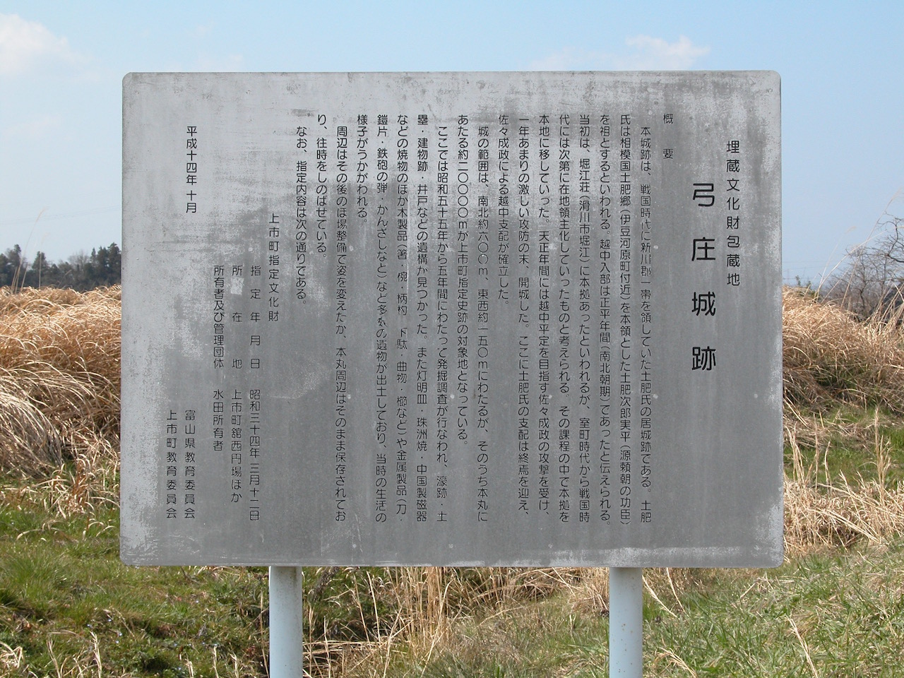 ただし、この上杉株式会社富山支社長という立場は長続きしなかった。天正6年、土肥政繁の後ろ盾だった上杉謙信が急逝。この機を逃すまじと神保長住(神保長職の嫡子とされる。なんでも父・長職と対立して出奔し、織田信長に仕えていたとか。このあたり、神保氏の内情もなかなか複雑だったよう)が織田軍の先鋒として越中に侵攻、神保氏ゆかりの富山城の奪還に成功。ここに越中の政治情勢は再び激変することになる。そして、天正8年にはいよいよ佐々成政が越中に乗り込んでくることになるわけだけれど、そんな中、土肥政繁としても生き残るためには織田家に従うしかなかったものと思われる。ここは現地・本丸跡に設置された碑から引けば――「天正六年上杉謙信が死去すると、上杉勢の庇護が受けられず、越中に侵攻する佐々成政、柴田勝家らの織田勢に従うことになったが(略)」。つまり、土肥政繁は、織田方――というか、直接的な指揮命令系統で言うなら、佐々成政の指揮下に入った――ということになる。ただ、これはよほど本人としては不本意な身の処し方だったと思われる。そのことは、碑文が続けてこう記しているのを読めばわかる――「天正十年に織田信長が本能寺に討たれると再び上杉勢に属したため、佐々勢の攻撃をうけることとなった」。なんと土肥政繁は信長が討たれると好機到来とばかりに織田方に反旗を翻しているのだ。実に油断のならない男……。しかし、ある意味、これは戦国武将としては真っ当なふるまいで、むしろなんであの局面でこの種の動きが全国に広まらなかったのか? と。あるいは、様子見を決め込んでいる内に、秀吉があっという間に事態を収拾してしまって、タイミングを逸してしまったということか? この辺はワタシがかねがね疑問に思っている点で、普通なら一斉に火の手が上がるところですよ。そして、それまで織田専制政治の先兵となっていた佐々成政のような前線指揮官クラスの武将はそういう同時多発的な反乱のうねりに呑み込まれて、それはそれは無残な最期を遂げるというのがお決まりのパターン。そのサンプルとしてここは『太平記』に描かれた越中守護・名越時有とその一族の最期を思い起してみるのもいいだろう。例の「上下七十九人、同時に腹を掻切つて、兵火の底にぞ燒け死にける」というやつね(何が「例の」かは「高岡市二塚にある『恒性皇子御墓』を見てきた事附二塚に鷲は舞い降りた事」参照)。で、天正10年もそのように歴史は動くかのように見えた――土肥政繁の目にはね。だから彼は「信長討たれる」の報に迷うことなく反乱の火の手を上げたのだろう。しかし、情勢はまたまた激変した。なんと、備中から駆け戻った秀吉が光速で事態を収拾。訪れるはずの「天下大乱」は訪れなかったのだ。織田政権の前線指揮官たる佐々成政もほどなく態勢を立て直して弓庄舘を包囲。織田家臣従の証しとして土肥家から差し出されていた政繁の次男・平助を見せしめのためとして磔にした。『土肥家記』所収の「弓之庄古城之圖」には「爰ヲハリツケ田ト云」と、磔にされた場所も特定されている。そんな中、政繁は再三再四、越後の上杉景勝に援軍を依頼している。しかし、それに対し返ってくるのは「とにかく頑張れ」という精神的督励のみ。ここはどうしたってあの『真田丸』で遠藤憲一が演じた「お館様」を思い起さざるを得ません。もうね、あの人を頼りにしちゃダメだって(笑)。いや、まあね、上杉景勝も上杉景勝で身動きが取れなかったんだろうとは思うんだけどね……。しかし、こうした状況にありながらも、弓庄舘はよく耐えた。9月には一旦、佐々勢は兵を引いているし、翌天正11年2月には成政の越後出兵の隙を突いて「安城」(安住城=富山城か? とするなら、果敢に敵の本丸に攻め込んだということになる)の城外を焼き払い、さらには「太田之新城」(太田本郷城か?)を奪うなど、縦横無尽のゲリラ戦を敢行している。で、この間、上杉景勝は家臣を京都に派遣して政繁の所領安堵を働きかけているらしい。「お館様」も一応はやってはくれていたのだ。しかし、秀吉は既に越中は佐々成政に宛行うと決めており、上杉景勝もそれを受け入れるしかなかったようだ。かくて、万策尽きた。「右の通にて、城内、弥、勢力も衰へ兵粮も尽る故」――とは、『土肥家記』が奏でる100年越しの悲歌。そして、天正11年8月某日(『立山町史』ではその日付を8月30日としているものの、この日付は上杉景勝が土肥政繁の奮戦を賞して与えた「御状」に記されているもので、この日が弓庄舘開城の日とは見なせない)、遂に弓庄舘は開城。土肥政繁は上杉家を頼って越後に落ちた。そして、その後、いずれかの時点で弓庄舘は廃城となったと思われるものの、それがいつ頃であるかは、「弓の里歴史文化館」でも「主だった家臣たちもこれに同行して去ったため、この時点で廃城になったものと考えられます」としているだけで、確たることは