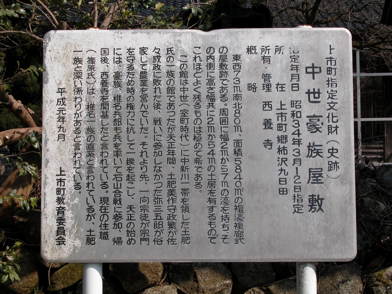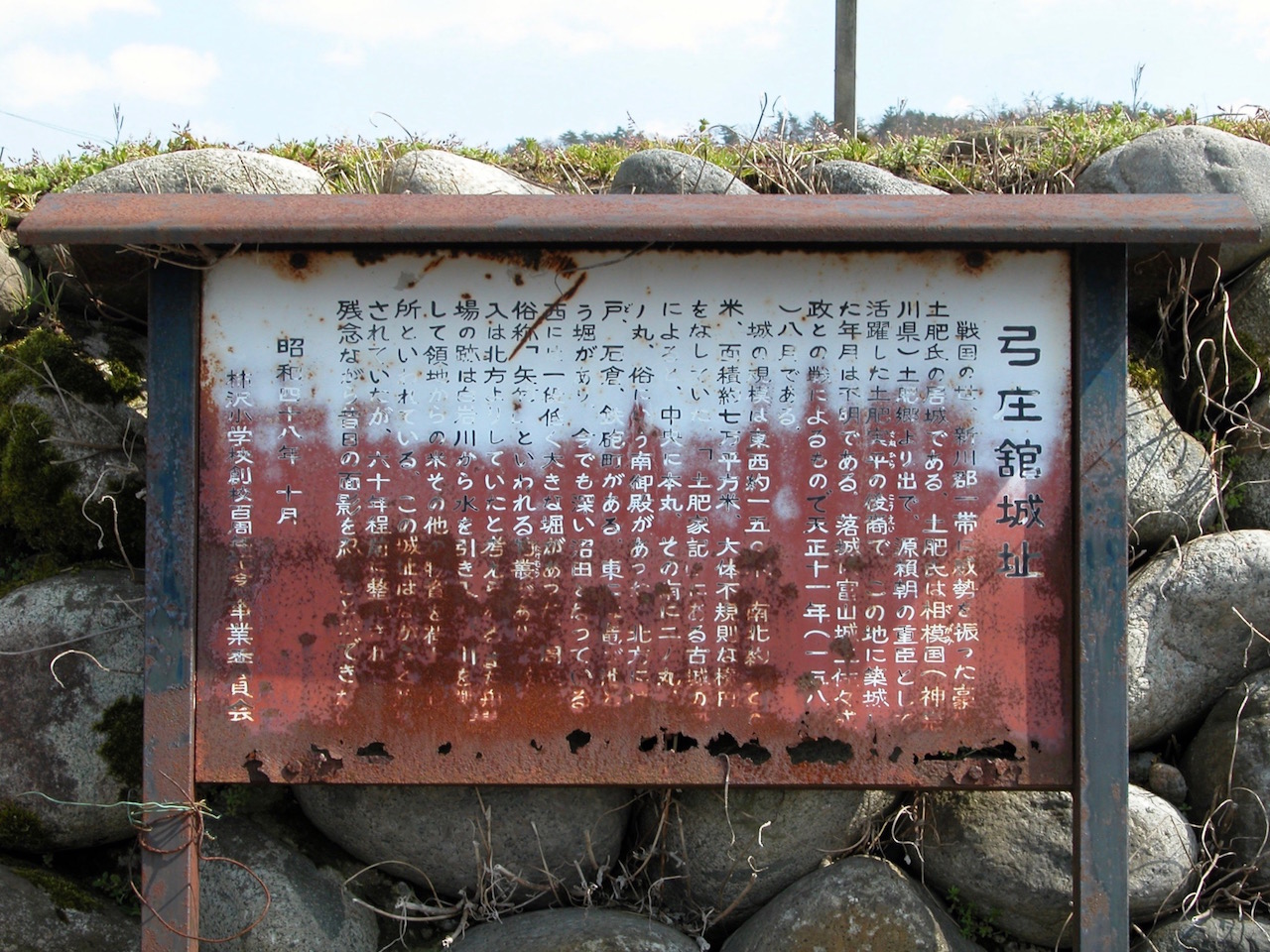 そうだなあ、これはどーしても書かなきゃならないわけじゃないんだけれど……えーい、書いちゃえ(笑)。こうした土肥政繁、ないしは上市町舘という土地への関心の背景にはちょっとした個人的事情もいくばくかは関係していると言っていい。というのは、ワタシの小学校時代の同級生に土肥千晴さん(一応、仮名、ということにしておきます。何が「一応」かは、まあ、ご想像におまかせするということで……)という女の子がいたのだ。とても勉強のできる子で、しかも相当に大人びていた。一般的にこの年代は男子よりも女子の方が成長が早いらしいので、そういう印象を持つことはありうるだろうけれど、土肥さんは他の女子生徒と比べても大人びていた。言葉遣いが違ったんだよなあ。大人みたいっていうか……。で、これがちょっと不思議なんだけれど、そんな土肥さんがどういうわけかワタシに好意を持ってくれたようで。一度、わが家を訪ねてきたことがある。同じクラスの宮崎恵子さん(同)という女の子と2人で。ドギマギしたワタシは満足に口をきくこともできなかったのを覚えている。そんなワタシを見て土肥さんは「いつものオカムラくんと違う」――とかなんとか。「いつものオカムラくん」は、まあ、なかなかひょうきんな方だったとは思う。ただ、何が原因だったか、ワタシが学校で泣いたことがあって。その時、土肥さんはこう言ったんだよね――「男が泣いていいのは、親が死んだ時だけだよ」。そういえば、家に招待されて一泊したこともあったはず(あるいは、ただのお昼寝だったかなあ。土肥さんのお母さんなんかと一緒に川の字になって寝たのは覚えているんだけれど……)。まあ、ひょうきんだったり、シャイだったり、泣き虫だったり。そんな子ども子どもしたワタシに「母性本能をくすぐられた」というやつですかねえ……。で、多分、あの土肥さんは、この「弓庄舘城址」ないしは「弓庄城跡」のかつての主である土肥政繁の末裔ではないのか? と、最初にこの場所を訪れた時点で。小学生にしてあの大人びた雰囲気とは、よほどの遺伝子を受け継いでいると見るべきで、先祖は戦国武将――というのも、いかにもありそうな話かなと。もっとも、これは今回、調べて初めて知ったのだけれど、土肥政繁は天正11年にこの地を追われて越後に落ち延び、同18年、同地の能生(現在の糸魚川市能生)で病没。残された一族は出羽に渡ってあの最上義光(「戦国一のワル」とされる武将。『独眼竜政宗』では原田芳雄がワイルドに演じておりました)に仕えたりしたものの、最終的に家系は断絶したとされる。その一方で政繁と行動を異にした土肥家傍流(別に真田一族の「犬伏の別れ」みたいなドラマがあったわけではなく、単に病弱のため、行動を共にできなかったらしい)は越中に残り、「俗家して農業を営んでいた」――とは、上市町郷柿沢にある上市町指定文化財「中世豪族屋敷」に設置された案内板の一節。もし土肥千晴さんが土肥氏の末裔だとするなら、直接的にはこちらの流れということに? それにしても大変な豪農ではある。