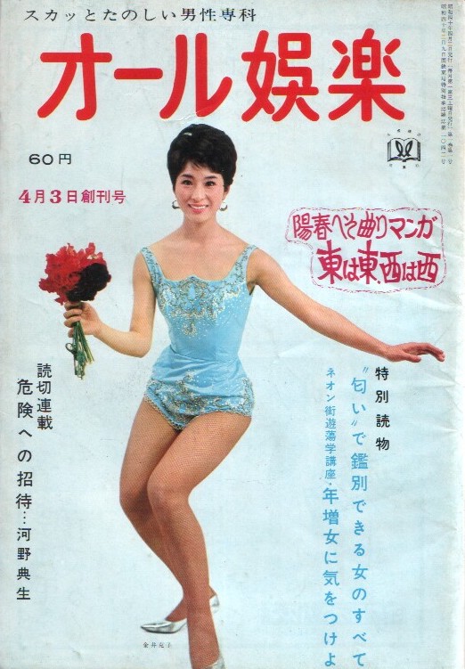 ということで、河野典生には紛うことなき「通俗ハードボイルド」作家という一面もあったわけだけれど、しかしこうした事実を彼は「なかったこと」にしてしまいたかったようだ。というのも、彼は1973年に自身初の文庫本として刊行された角川文庫版『陽光の下、若者は死ぬ』巻末に収められた「年譜風あとがき」の「一九六五年―六六年(三十歳―三十一歳)」の項でこの2年間について「体調を崩し、ほとんど仕事をしなかった」。でも、この「危険への招待」はまさにその間に連載されたものだし、他にも多くの作品を雑誌媒体に発表していたことが戸田和光氏作成の「河野典生 作品リスト(暫定作成版)」で確認できる。にもかかわらず彼は「体調を崩し、ほとんど仕事をしなかった」と……。ちなみに、『オール娯楽』は「危険への招待」第1話が掲載された1965年4月3日号が創刊号(→コチラがその表紙。モデルを務める〝お女性〟はかの金井克子であります)。そして「危険への招待」はその巻末に目玉記事よろしく掲載されている。河野典生は前年に『殺意という名の家畜』で日本推理作家協会賞を受賞しており、当時、文芸ジャーナリズムが注目する新進作家だった。双葉社としても期待するところ大だったに違いない。しかし、そうして発表された作品への思い入れは当人には一切なかった、ということなんだろう。でなけりゃ、自身初の文庫本の巻末にあたかも「ぼく自身のための広告」よろしく収められた「年譜風あとがき」においてこんな扱いをするはずはないもの。あるいは彼には文芸ジャーナリズムに求められるままに「危険への招待」のような〝通俗的〟な作品を書いてしまったことを恥とする気持ちでもあったのだろうか? しかし、だからといって、現にこうして存在する十数編もの作品を「なかったこと」にするなんて……。(追記:本文で記した「リチャード・S・プラザーのシェル・スコット・シリーズなんてガス気球を使って危機を脱するという、いくらなんでもそれはないだろう、というような悶絶シーンまである(そうです。ワタシは読んでいませんが→読みました。1955年刊行のStrip for Murderがそれで、最後に確かにガス気球を使って危機を脱する)」という件。実はこれによって1つハッキリしたことがある。河野典生の「腐ったオリーブ」の最後がこの「悶絶シーン」とそっくりなんだよね。「腐ったオリーブ」の方は気球をつなぐロープに手足をからませたギル(黒人)の姿を「黒いキリストだった」と形容してみせるなど、もう少しシリアスな描写にはなっているものの、気球を使って危機を脱するという根本は同じ。正直、これをどう捉えたらいいものやら……。いやね、多分、これって、パクリとかいうんじゃなくてオマージュとかパスティーシュとかに当たるんだろうとは思うんだよ。でも、そもそも河野典生ってこんなことをするような作家だったの? と。だって、リチャード・S・プラザーですよ。シェル・スコット・シリーズですよ。そのパスティーシュを河野典生が? そうと知っていれば、この「河野典生と「通俗ハードボイルド」」だって、もう少し書きようがあったんだ。加えて『三匹の野良犬』なんて快(怪?)作も読んじゃったしで、今、結構、深刻にアタマを悩ましていて……。追々記:いやー、オドロイタ。結城昌治の1966年の作品『白昼堂々』のラストでも同じようなネタが使われているではないか! こちらでは銀三(泥棒)がデパートの屋上からアドバルーンにしがみついて天高く舞い上がる。ただし、着地した場所は刑務所の中だったという皮肉な結末。中田耕治曰く「最終章のデヌーマン(掉尾)を読んで笑わない人がいたら、その人は精神病院に行って診察してもらう必要があるんじゃないかな」。これぞ結城「ファルス」の真骨頂?)