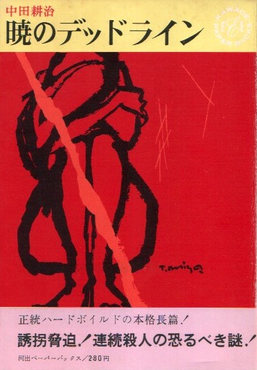 ただ、ここに少しばかり興味深い事実がある。当時、彼が書いた本がどのようにマーケティングされていたか? 実は「正統ハードボイルド」として売り出されていたのだ。『危険な女』の巻末に掲載された野尻鷹雄(肩書きは「日本短波放送プロデューサー」。なんでも中田耕治は『危険な女』が刊行される2年前の1959年に短波放送で放送された『消えた女』という連続ドラマの台本を担当していたとかで、上述「中田耕治 略年譜」によれば「これが『危険な女』に発展する」。この『消えた女』の担当プロデューサーが野尻鷹雄だったらしい)による解説には――「そして、その意味で、中田さんはこの作品で、わが国では、今まで書かれるべくして書かれなかった正統の行動的なハードボイルド小説を、はじめて達成したものとして賞讃されていいと思う」。さらに川崎隆シリーズ第2作『暁のデッドライン』(本書表紙裏の「作者のことば」では『危険な女』『消えた女』につづく川崎隆シリーズの第3作とされているのだけれど、「中田耕治 略年譜」の説明に従うならば、『消えた女』は小説ではなくラジオドラマということになる)になるともっと露骨で、帯にはハッキリと「正統ハードボイルドの本格長編!」と記されていた。