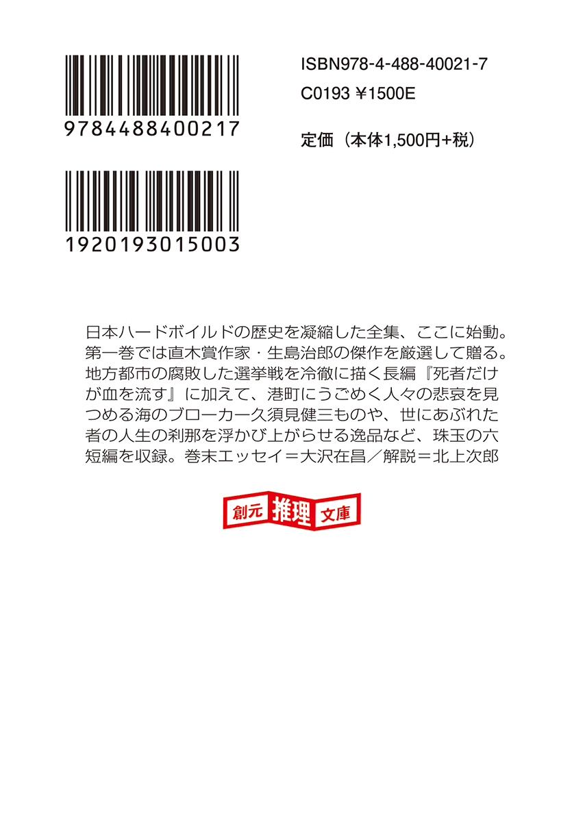 ――と、ハードボイルド・ファンのはしくれとして本全集の刊行開始にエールを送った上で……しかしだ、この第1巻「生島治郎集」に収録されている長編が『死者だけが血を流す』であることには、正直、疑問が。ここは素直に『追いつめる』で行くか、さもなくばデビュー作の『傷痕の街』とすべきではなかったか? また「鉄の棺」が収録されていないことにも疑問を覚える。初期生島作品の中でも最も硬質なハードボイルド・タッチを味わえるのはこの傑作中編ですよ。今、『日本ハードボイルド全集』と銘打ってこの日本の湿潤な風土にハードボイルドという「ドライな文学」を移植しようとした先人たちの業績を回顧しようとする時、その対象に「鉄の棺」が含まれないというのはありえない。「鉄の棺」は単に初期生島作品の中で最も硬質というだけではなく、日本人の手によって紡がれたハードボイルドの中でも最も硬質なハードボイルド・タッチを味わえる作品と言ってもいいくらいで、それがネグレクトされるというのはねえ……。仮にワタシが生島治郎を読んだことがないという若い読者に、だったらこれを読め、と1作だけ薦めるとするなら、迷わずに「鉄の棺」だな。