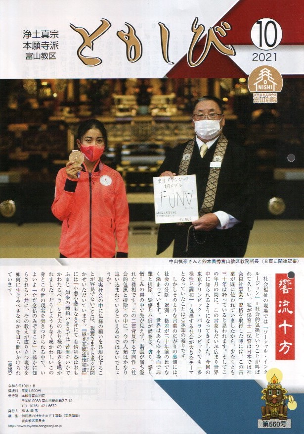 月命日に合わせてお寺さんをお招きして、いわゆる「月忌法要」というものを執り行うのが世間的にはどれほど一般的なのかは知らないけれど、当地は「浄土真宗の金城湯池」と呼ばれている土地柄でもあり(加えて父は毎朝のお勤めを欠かさない実直な念仏者だった)、わが家では毎月6日は朝一でお寺さんをお招きしして2010年1月6日に満85歳で亡くなった父の「月忌法要」を執り行うのが習わしとなっている。で、いつの頃からか、この際、お寺さんから教区報なるものを頂くようになった。教区報とは聞きなれない言葉だと思うんだけれど、なんでも浄土真宗本願寺派では「全国を5連区、32教区・特区(31の教区と沖縄県宗務特別区)に分けて教務所を設置し、各教区は533の組(そ)に地域割りしている」(ウィキペディア)とかで、教区報とはそれぞれの教区が発行する広報誌ということになる。で、わが家に配布されているのは浄土真宗本願寺派富山教区が発行する教区報である『ともしび』。しかし、仏教系の広報誌でこの題号をねえ。印象としては、キリスト教系の広報誌の題号という感じなんだけれど……。ともあれ、そんな『ともしび』ではあるのだけれど、父と違って信心の定まらないワタシはこれまでは開いたことすらなかった。しかし、この2021年10月号は違った。もう一目見るなり、へえ、と。その好奇心の由って来たるユエンが表紙を飾る中山楓奈さんだったことは言うまでもない。彼女が銅メダル獲得以来、一体どれくらいのインタビューを受けたかは知らないけれど、その度ごとに彼女が醸し出すニル・アドミラリと言ってもいい雰囲気(要するに、笑わない、ということ。それは、つまり、「媚びない」ということでもあります)に惹きつけられているものとしては、これは、へえ、ですよ。しかも、仏教系の広報誌の表紙という、一見、場違いと思えるシチュエーションでの遭遇だというのに、え、どうして? とは思わない。一瞬の間こそあれ、そうか、彼女は龍谷高校だったな……と、納得してしまうというね(つまり、彼女のパーソナルデータはあらかたわが〝灰色の脳細胞〟にインプットされているということであります)。そんなワタシだから、普段は見向きもしない「教区報」なるものを手に取ってみたわけだけれど……思いもかけないことにこの浄土真宗本願寺派富山教区教区報『ともしび』2021年10月号はもう1つの理由でワタシの好奇心を鷲掴みにすることになった。