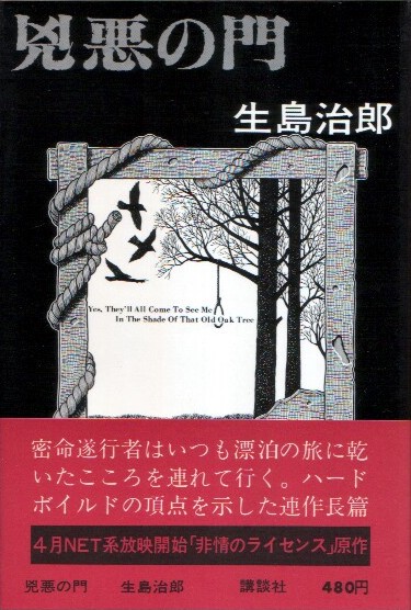 また、腰巻きにも要注目。まず、オモテに記されたキャッチコピーは――「密命遂行者はいつも漂泊の旅に乾いたこころを連れて行く」。実に読ませるじゃないか。しかも、なんというか、〝作家性〟を感じさせるとでもいうか。もしかしたら書いたのは五木寛之では? そう想像させるだけの客観的事実があって、この本が刊行された1973年当時、五木寛之は雑誌『面白半分』の編集長を務めていた。『面白半分』の編集長としては第4代に当たるのかな? で、この年、彼が立ち上げた文学賞(?)があるのだ。それが「日本腰巻文学大賞」。五木寛之という人は本の腰巻きなるものに格別の愛着を持っていたようなのだ。だから、このキャッチコピーもきっと五木寛之の作だろうと。なお、「日本腰巻文学大賞」の第1回受賞作は山口瞳著『酒飲みの自己弁護』(新潮社)。その選評は『面白半分』1973年12月号で読めるのだけれど――「このコピーは丹念に手づくりされた味がいい。そしてその味わいが本の中身の味とうまくとけあって、上等の食前酒の役目をはたしている所がいい。しいて難を探せば、コピーのほうがちょっといい気分に酔った所があるような気がする。本の中身に酔わなきゃいい文句は書けないのは当然だが、読者を酔わせるのが腰巻の最後の目的だから、ある一点で醒めてもいなければならないのである。腰巻の作り手は、立派なポン引きに徹しなければならないので、客になっては困る。そこが難しい所だ。いずれにせよ、当節、こんなに愛情をもって巻かれる腰巻なんてものは少ないのである。著者の山口瞳氏は、幸せなお人だ」。で、その伝で行けば「著者の生島治郎氏は、幸せなお人だ」、とも言えるかなと。というのも、この本の腰巻きにはオモテに五木寛之作と思われるキャッチコピーが掲げられている上にウラにも五木寛之のこんな推薦の言葉が掲載されているのだ――「わが国でハードボイルド小説を書くことの難しさは、日本人が本当のジャズをやることの苦しさと似ている。いずれもこの湿った風土と人間に包囲されての孤立した戦いだからである。「黄土の奔流」からこの「兇悪の門」にいたるまで、生島治郎の書く物語の中には、一貫して「神ながらの道」へ続く日本的浪漫への強い嫌悪と抵抗の感情が流れているようだ。彼の小説の面白さとともに、その側面も私が生島治郎の作品に強い共感をおぼえる理由のひとつである」。いやー、なかなかですよ。五木寛之が他人の著作に推薦の言葉を贈った例としては平岡正明の『山口百恵は菩薩である』(講談社)が知られていますが、あれと並ぶ力の入った文章と言っていい。天下の五木寛之にここまでやってもらったんだから「著者の生島治郎氏は、幸せなお人だ」。ともあれ、そんな感じで、この本は五木寛之と生島治郎の特別な関係を裏付けるある種の〝標本〟のようなものである、と。