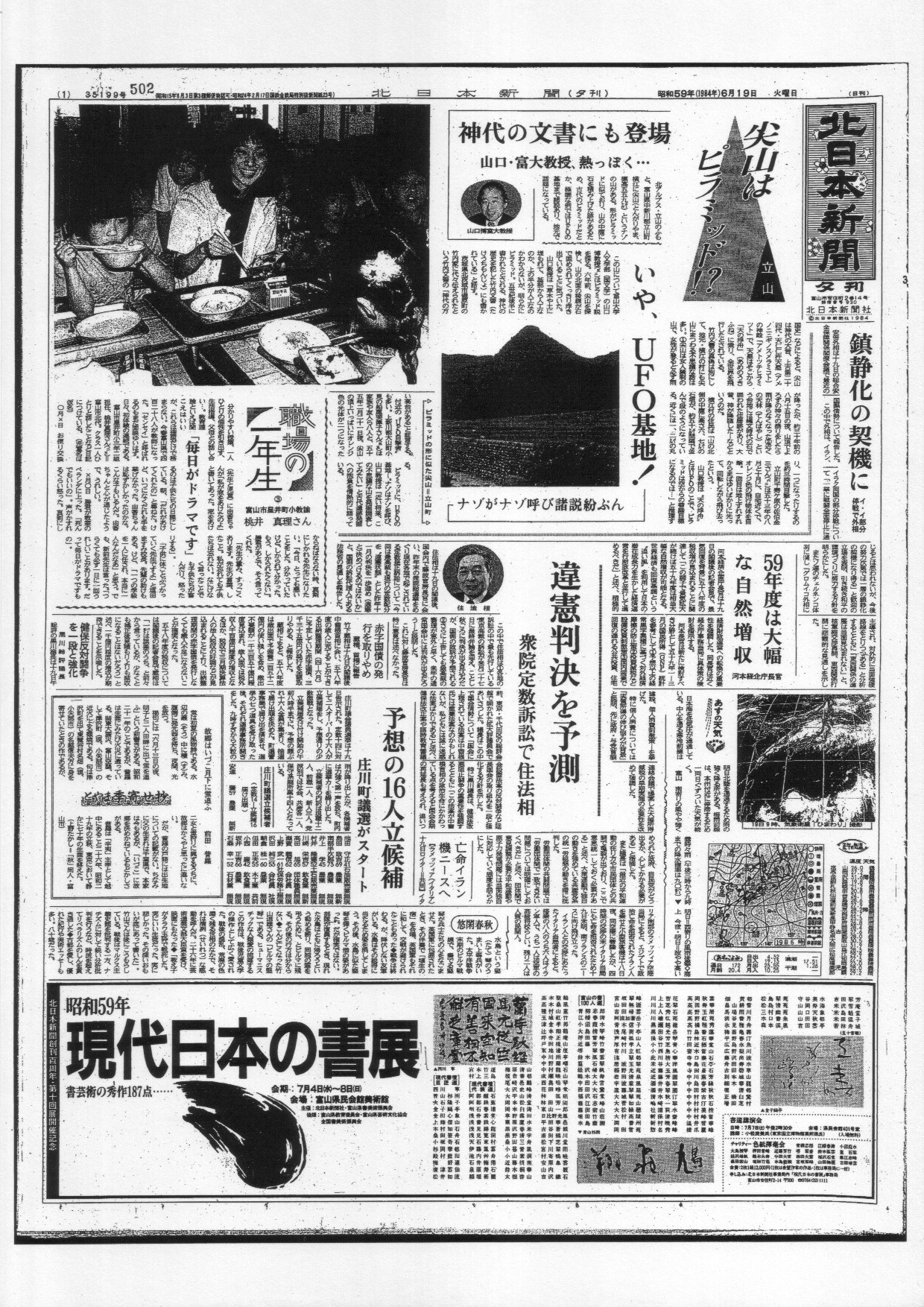 なんと、1984年6月19日付け夕刊の1面トップですよ。タブロイド紙ならぬ一般地方紙の1面トップで「尖山はピラミッド⁉ いや、UFO基地!」。なんとも攻めた見出しですが、北日としても、富山大学人文学部教授のお墨付きがあるから、という安心感があったんだろうな。ただ、それにしたって、よくもまあ、とは思うよ。だって、こう書かれてるんだよ――「茨城県北茨城市磯原町の竹内文書の「神代の万国史」などによると、尖山は神代の大昔、上古第24代・天仁仁杵天皇(アメノニニギノスメラミコト)の神殿「アメトツチヒラミツト」で、天皇はそこから「天の浮舟」(あめのうきふね)に乗り、全世界を飛行したとされている」。そういうことをね、記事には顔写真入りで紹介されている富山大学人文学部教授・山口博氏(なお、現在の肩書きは不明。お年から考えて、もうリタイアされているのかな?)が、この年、突如としてぶち上げて、それがこうして北日本新聞の1面トップを飾ることになったわけだけれど……ここで1つ耳寄りな情報を提供しておくなら、実はこの記事を書いたのは北日の記者じゃないんですよ。この分野の著書を多くお出しになっているオカルト研究家の布施泰和氏が共同通信富山支局の記者だった頃に書いたものであることをご自身のHPで明かしておられるのだ(それが、こちらです。布施氏が件の記事を書くきっかけになった山口教授の講演録「富山サイエンス・フィクションの世界――古代の空想と事実――」も再録されております。これは、一読の価値あり)。要するに北日は共同通信が配信した原稿を夕刊の1面トップに持ってきたわけだけれど……ここは当時の整理部長の英断に拍手を送っておきましょう。ワタシはここに1人の〝みゃあらくもん〟の生きざまを見る思いであります……。でね、この後も北日はこのネタを追いかけていて、1986年1月3日号ではなんと見開き2面を使っての大特集。題して「富山にピラミッド? 尖山の〝なぞ〟を追う」。もちろん、こちらにも山口教授はコメンテーターとして登場しておられます。そりゃあね、この仮説の言い出しっぺなんだから、センセイのコメントは欠かすことはできませんよ。いずれにしても、尖山=ピラミッド=古代宇宙船の基地説は、1984年、富山大学人文学部教授の頭脳から発して、今や全国的に知られるところとなっているわけだね。